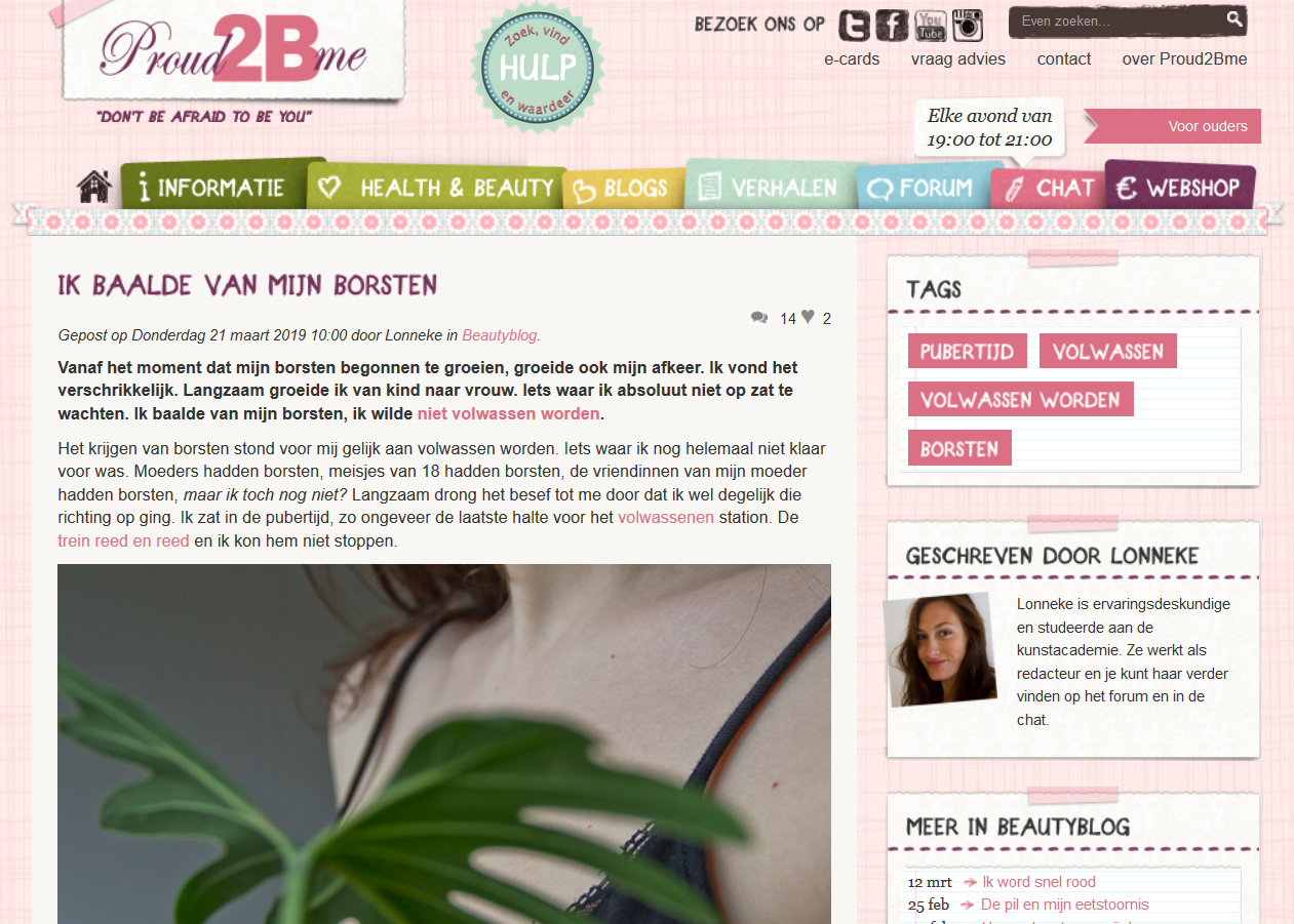 In de puberteit vinden verschillende biologische ontwikkelingen plaats. Zo gaan bij meisjes de borsten groeien, de groeiversnelling vindt plaats, het schaamhaar begint te groeien en de eerste menstruatie zal in de puberteit plaatsvinden. Niet alle meiden vinden dat zo fijn. Op de site www.proud2bme.nl verteld een meisje dat ze erg baalde van haar borsten. Ze zegt dat haar afkeer begon te groeien naarmate haar borsten verder groeide en dat ze er helemaal niet op zat te wachten om volwassen te worden. Ze ontwikkelde een eetstoornis waardoor ook haar borsten kleiner werden. Bij een ander mens had ze de borsten prima gevonden, maar op haar lichaam vond ze alles lelijk aan haar borsten. Op het internet zocht ze naar borsten om te die te kunnen vergelijken met die van haar, om te zien of ze wel "normaal" waren. De afkeer tegen haar borsten maakt het haar moeilijk om over de eetstoornis heen te komen. Iedere keer zagen haar borsten er weer anders uit en moest ze daaraan wennen. Later kwam bij haar de realisatie wat voor rol haar borsten zouden spelen bij het moederschap en hierdoor is ze op een andere manier naar haar borsten gaan kijken. Wat haar heeft geholpen bij de acceptatie is het lief zijn voor haar lichaam, door het bijvoorbeeld in te smeren met bodylotion. In deze blog komt heel mooi naar voren hoe moeilijk het kan zijn voor een tiener dat het lichaam zo aan het veranderen is. Ze vertelt dat ze dus op een negatieve manier naar haar eigen lichaam keek. Dit maakt dat ze last had van een negatief zelfbeeld.