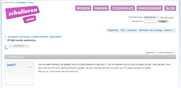 Bij jongens vinden ook verschillende veranderingen plaats in het lichaam. Bij de jongens gaan de testikels zich ontwikkelen, verschijnt het eerste schaamhaar, begint de penis te groeien, vindt de eerste zaadlozing plaats en begint de groeiversnelling (Van der Wal en de Wilde, 2017). Op een forum op scholieren.com verteld een jongen trots dat hij zijn eerste zaadlozing heeft gehad. Niet alle pubers kijken op een negatieve manier naar het veranderen van hun lichaam en sommige zijn er juist trots op.